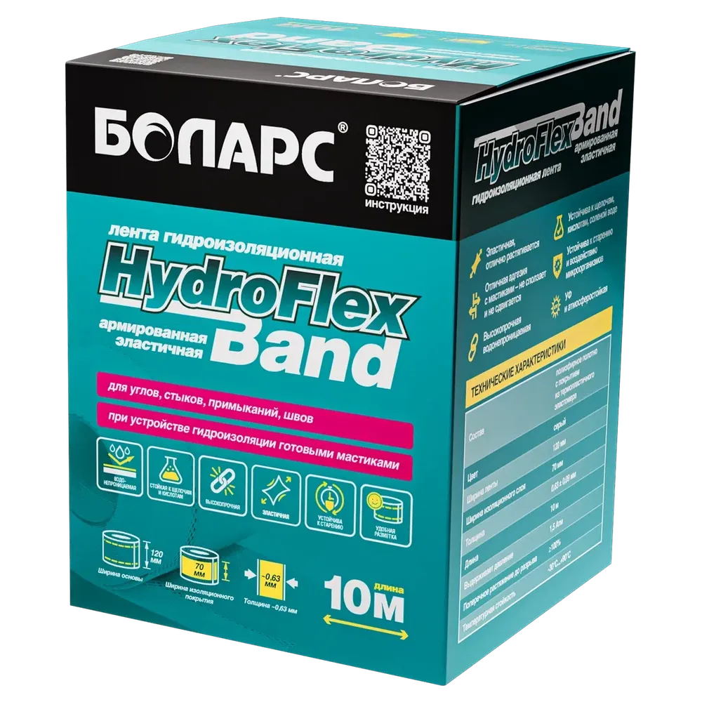 БОЛАРС HydroFlex Band – это эластичная армированная гидроизоляционная лента из полиэфирного полотна с покрытием из термопластичного эластомера. Предназначена для гидроизоляции в углах, местах стыков, примыканий и швов в сочетании с гидроизоляционными мастиками БОЛАРС HydroFlex, БОЛАРС